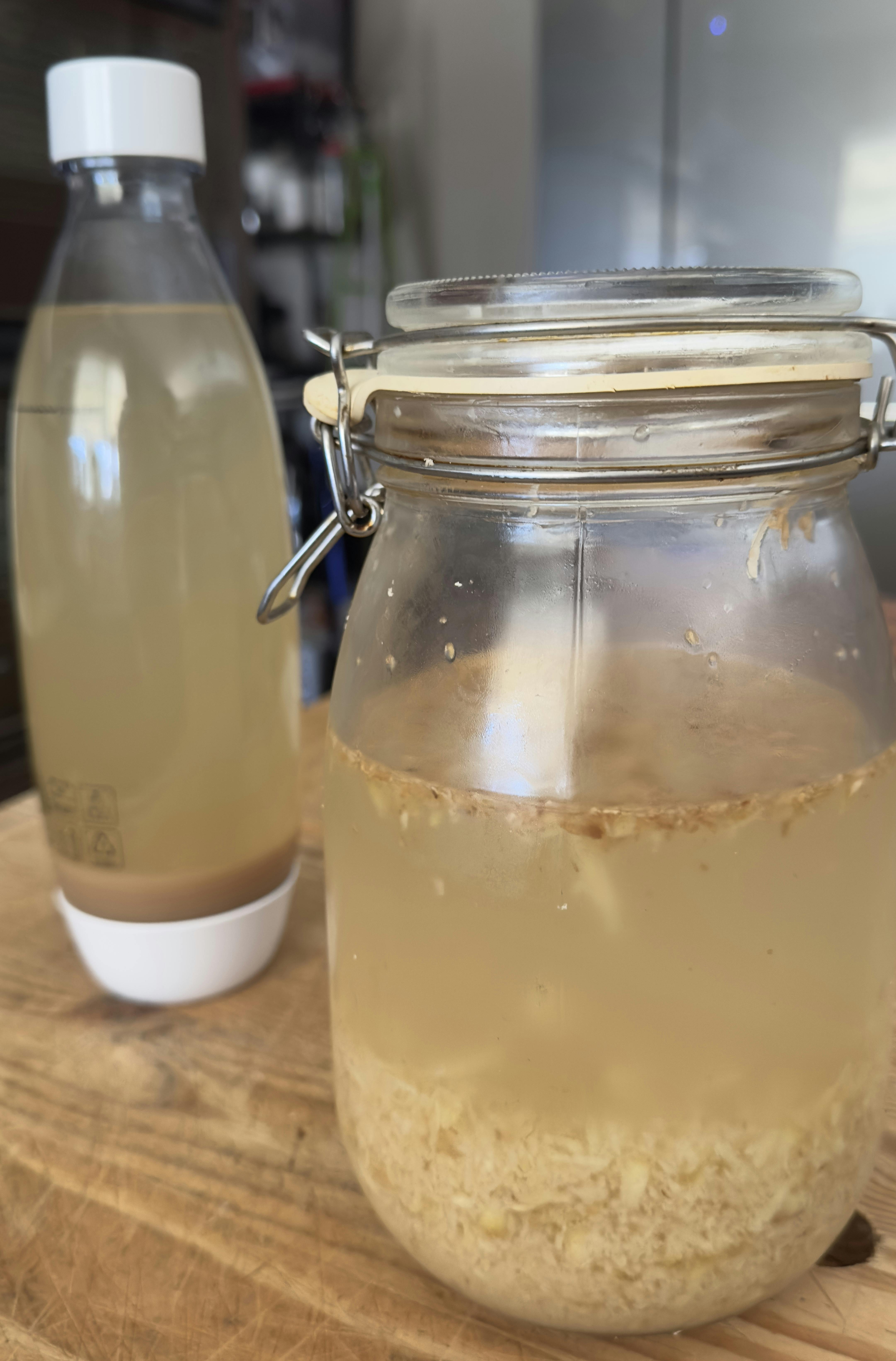 Once cooled strain with muslin, good teaspoon of raw sugar in bottle two inches of Bug strained, top up with liquid leaving expansion in top bottles round and tight sealed lids. Burp daily once gaseous put in fridge cool 24 hours and enjoy.